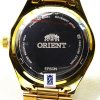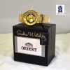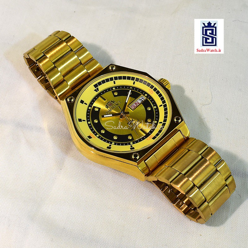 اورینت با موتور قدرتمندژاپنی دوتقویم روزشمار و ایام به زبان لاتین طلایی درب استیل اندیکسهای و عقربه ها قابل شارژ و نوردهی طبق تصاویر ثبت شده