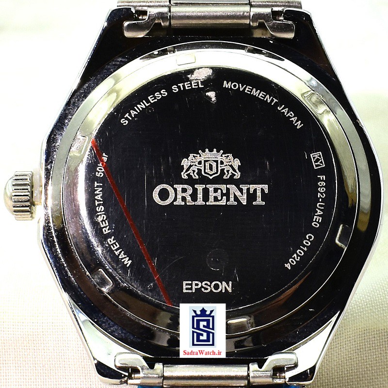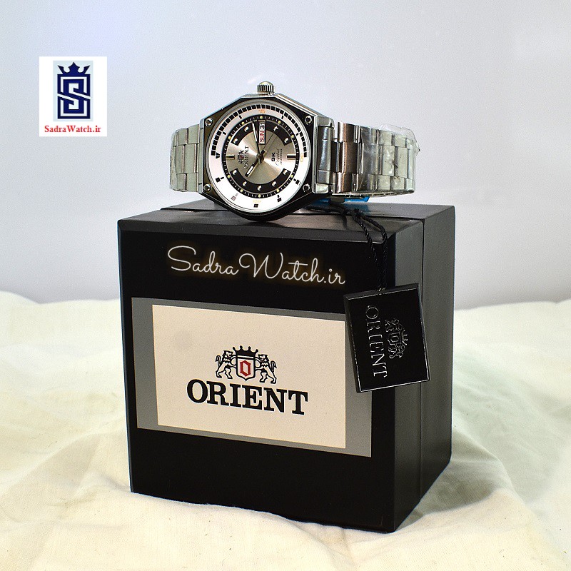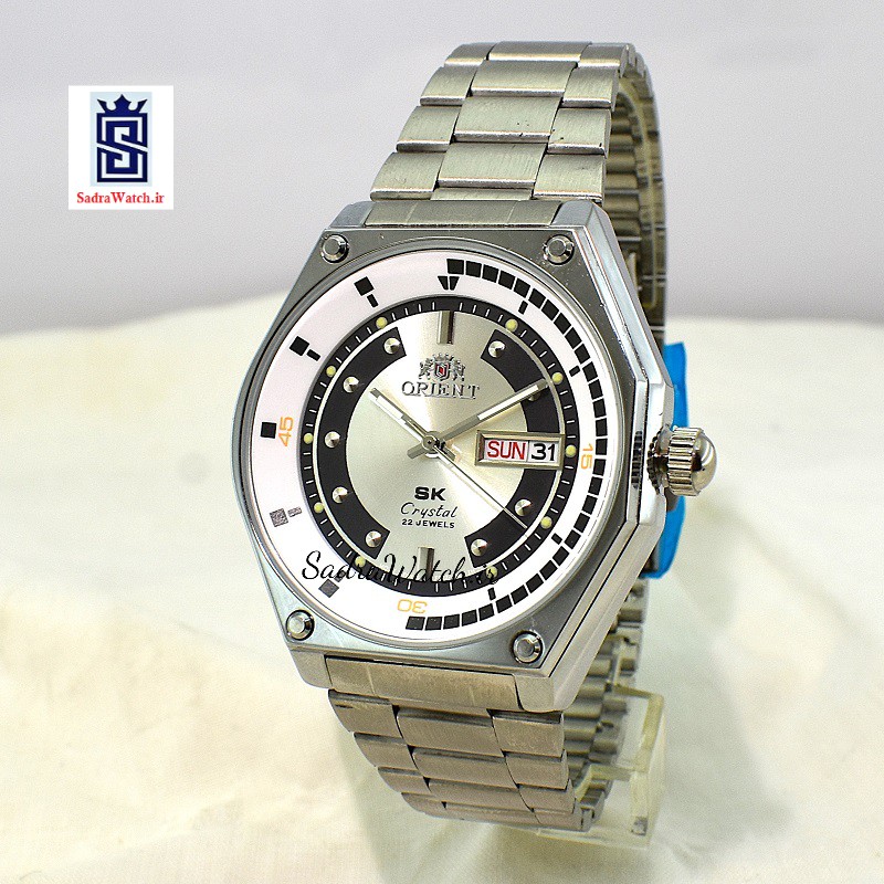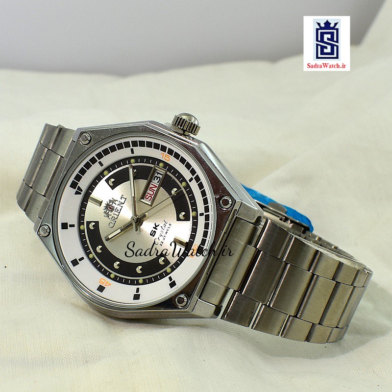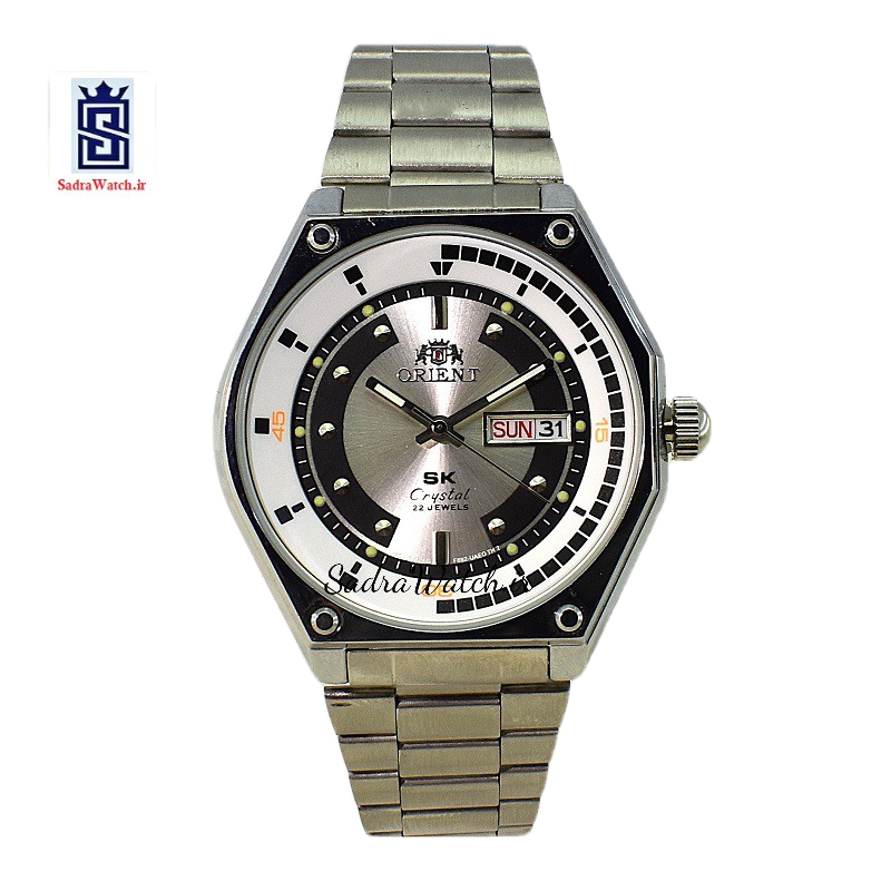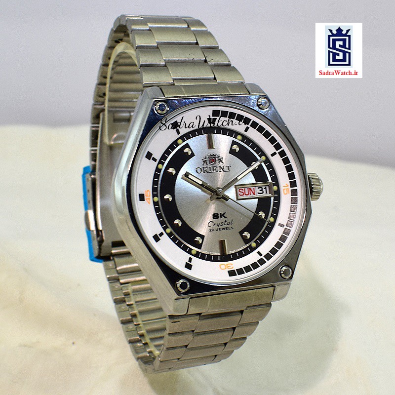 اورینت با موتور قدرتمندژاپنی دوتقویم روزشمار و ایام به زبان لاتین کلا نقره ای صفحه سفید مشکی نقره ای درب استیل اندیکسهای و عقربه ها قابل شارژ و نوردهی طبق تصاویر ثبت شده