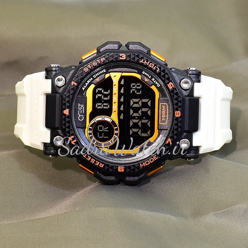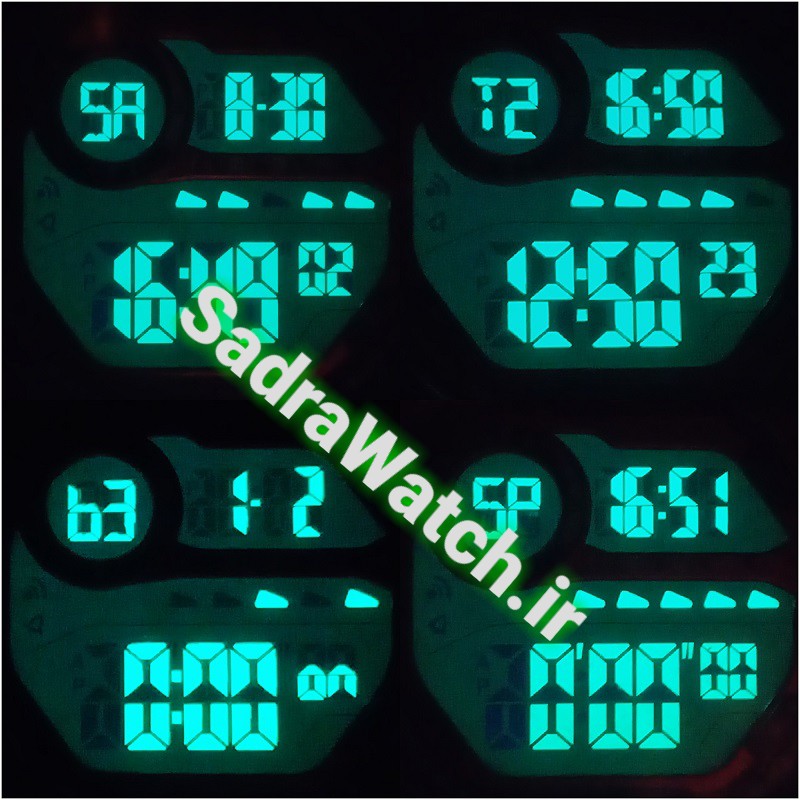 دارای امکانات دیجیتالی : T1 ساعت اول باثانیه شمار ** T2 ساعت دوم با ثانیه شمار ** تقویم روز و ماه سال به میلادی ** ایام هفته بالای صفحه ،، SP کرنومتر ،، AL آلارم + آپشن فوق العاده دیگر b1 تا b8 تعداد 8 آلارم مختلف با زمان و تاریخهای متفاوت میتوان تنظیم کرد ،، بهمراه چراغ پس زمینه طبق عکسهای ثبت شده بسیار زیبا