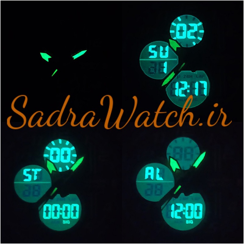 دارای امکانات نشانگر ساعت باثانیه شمار درشت ،، تقویم روز شمارو ماه ،، ایام هفته ،، کرنومتر ،، آلارم ،، بهمراه چراغ پس زمینه سبز رنگ ،،